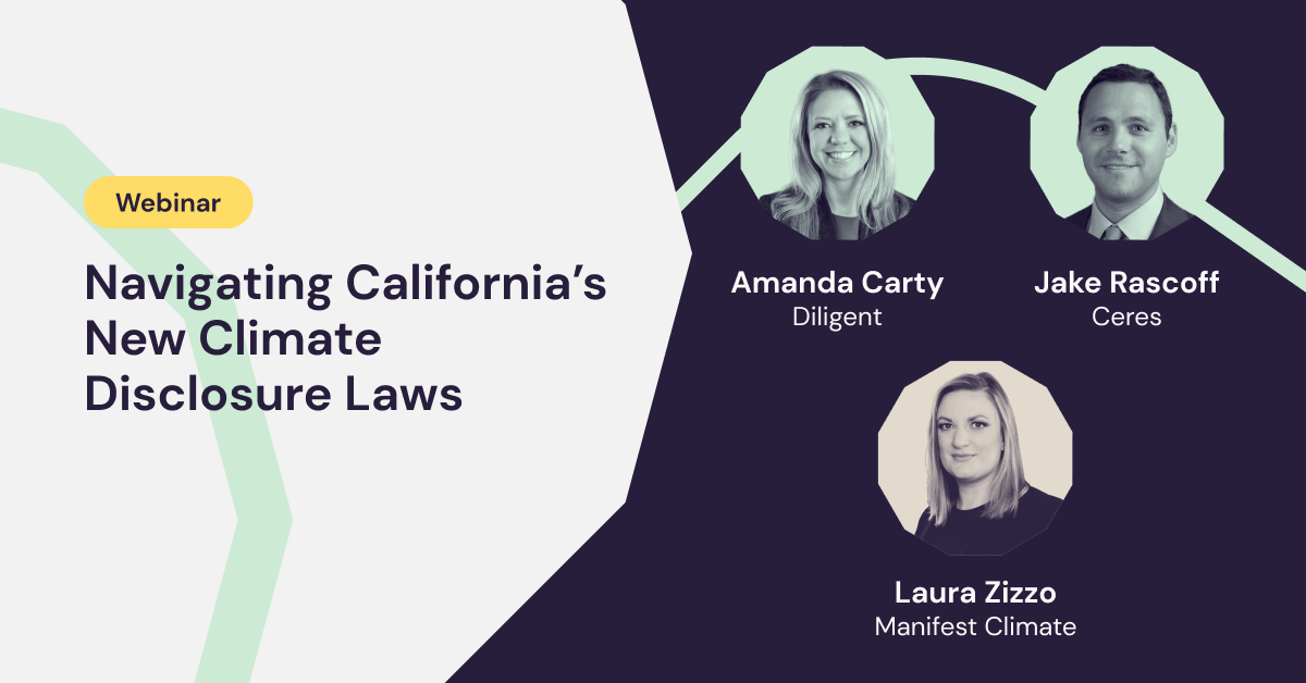November 30, 2023 Watch a groundbreaking discussion on California’s first-in-the-nation climate disclosure laws, SB 253 and SB 261. We explore the impact on businesses and hear insights from industry experts Laura Zizzo, Co-founder & CEO of Manifest Climate, Amanda Carty, Managing Director, ESG & Data Intelligence at Diligent, and Jake Rascoff, Director of Climate Financial […]