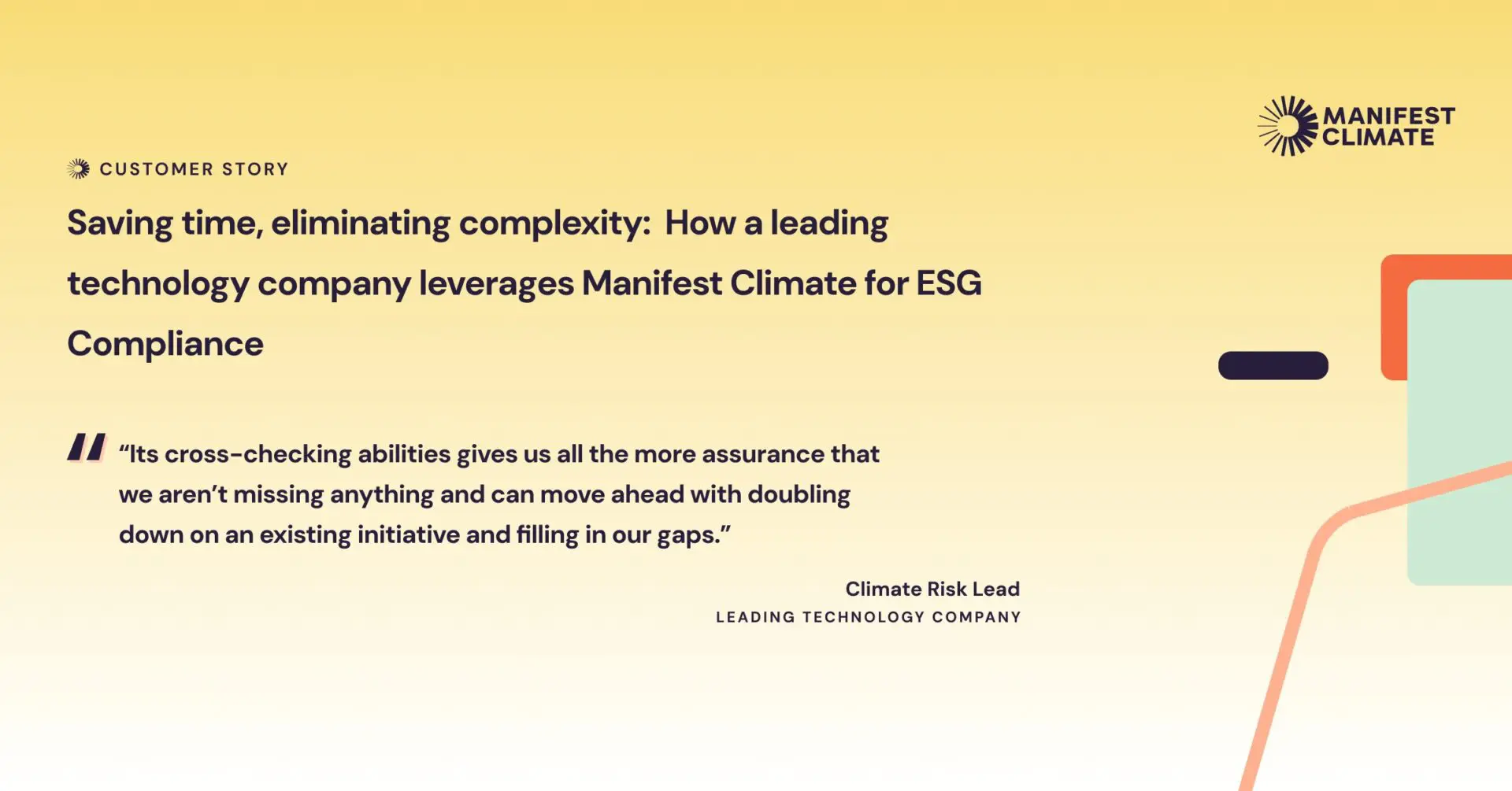 Within the company’s Sustainability team sits a smaller team responsible for the company’s climate risk program. The climate risk team is tasked with addressing physical and transition risks across data centers, supply chain officers, products, and services, and complying with relevant upcoming regulatory requirements. The team leverages Manifest Climate to assess the strength of its climate disclosures, benchmark against peers, and understand complex regulatory requirements.